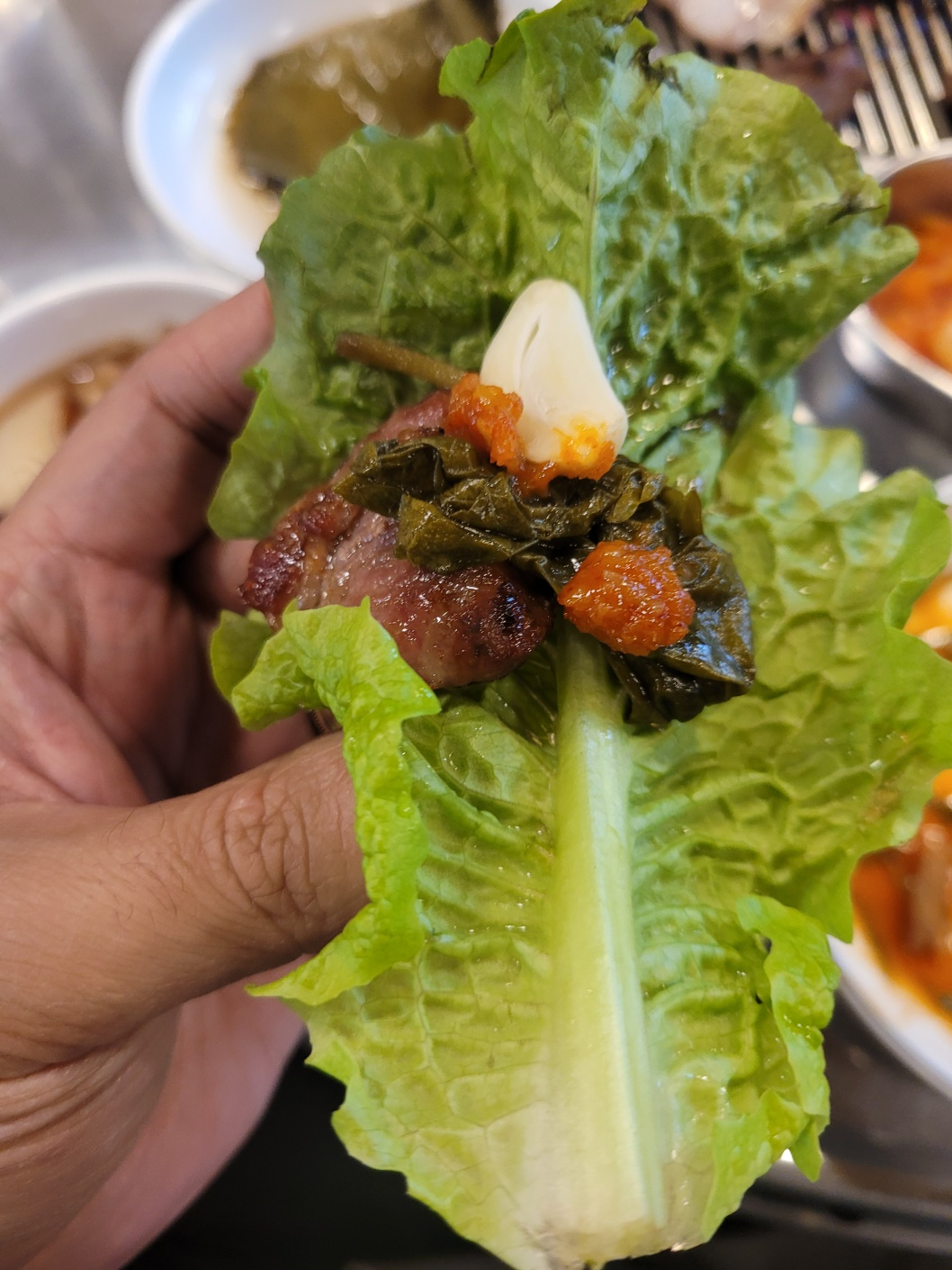 저 갯잎 장에 고기를 싸먹으면 정말 맛있습니다.